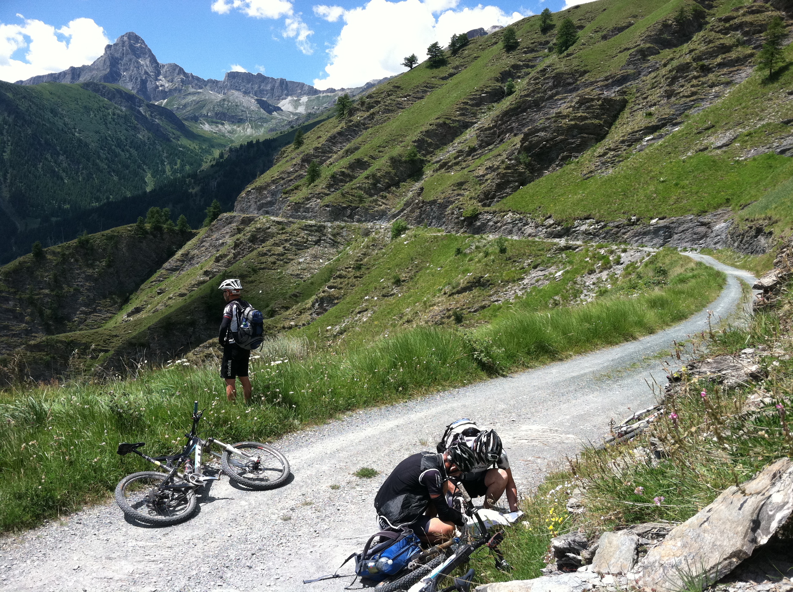 7/10/12 - Roman and Hendrik check where the single track peels off. Have to appreciate that these roads were built with the blood of our forefathers'. Thousands of roads all through the mountains, perfectly crafted by hand, like this one here.